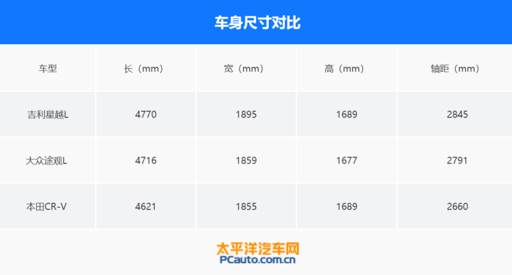 虽然星越L定位是一款紧凑型SUV,但它的车身尺寸并不紧凑,其长宽高分别为4770/1895/1689mm,轴距更是达到了2845mm,光看轴距数据的,星越L 2845mm的轴距甚至比丰田汉兰达(轴距为2790mm)还要长,和大众途观L、本田CR-V等车型拥有一定的优势。实际体验下来,星越L的确拥有着良好的空间表现。
