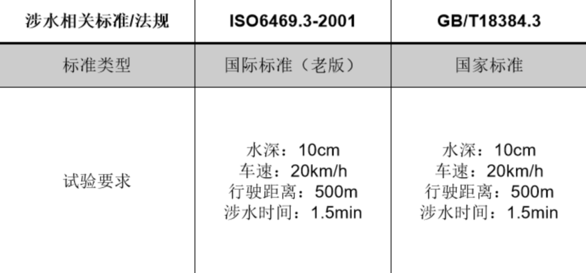 当然这些都是理论上的,因为除了电池组之外,车内还有其他别的电子设备,而这些电子设备并非都是IP67级别的,所以涉水过深的话,电池虽然不会出现问题,但其他的电器电脑很可能会出现无法使用的情况。同时,根据车身高度的不同,车内的电器电脑所布局的高度也会有所区别。因此,国家关于电动车涉水能力方面进行了实验要求。目前,新能源电动汽车涉水标准我们能够找到国内标准18487.3,以及国际标准ISO6469.3。