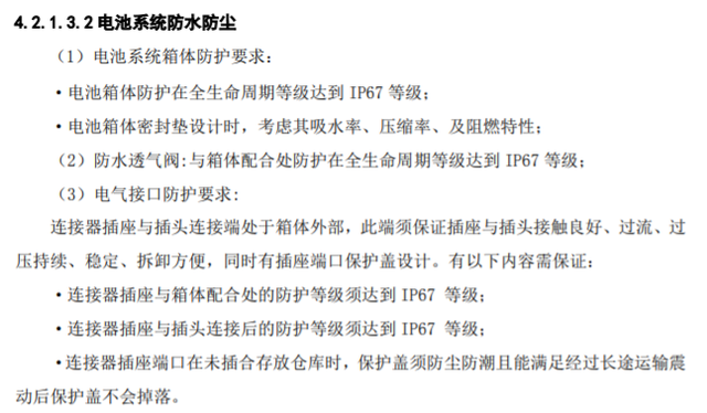 依据GB4208\IEC\EN60529标准,电动汽车电池系统的防尘防水等级建议为不低于IP67。IP防护等级由两个数字所组成,第一个数字表示防尘等级;第二个数字表示防水等级。数字越大表示其防护等级越好。电池系统的等级“IP67”,“6”代表完全防止灰尘侵入;“7”代表在1米深的水中浸泡不少于30min的状态下,低压监测功能正常、壳体内无进水。在GB/T18384-2015 安全要求中,对于防水明确提出了三种试验规则:模拟清洗、模拟暴雨、模拟涉水。在GB/T31467.3-2015中,还提出了海水浸泡实验,也是模拟和接近故障工况的一种实验方法。