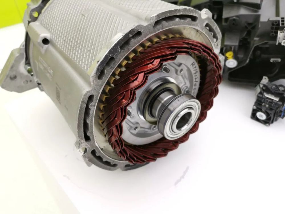 这台电机集成了单速减速箱(其实就是只有1个挡位的变速箱)以及功率电子装置(一般说“电控”),所以这种类型的电机我们一般也会称为“三合一电机”。