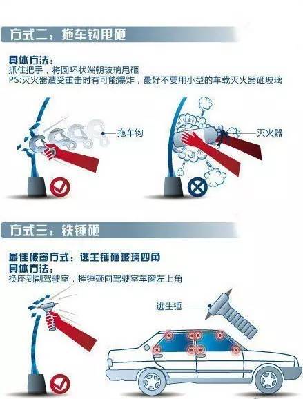解除安全锁,迅速完全摇下车窗,不要急于松开安全带。这几步是最重要的。