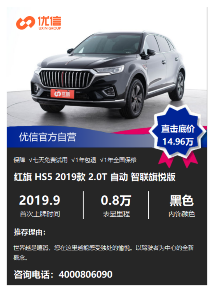 这款HS5配置尚可,如果2万公里左右,目前市场实际零售行情在14万元以内,考虑到这台车0.9万公里,并且有优信的保障和服务,15万元以内是比较合理的范围,短期内这款车是目前市场能找到最新和里程数最少的二手车。
