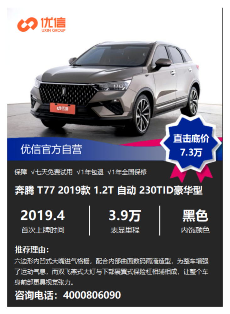 奔腾T77可以算是半价版本的红旗系列SUV孪生弟弟,营销推广力度不行,但是性价比非常好,花五菱MPV的钱买个奔腾大SUV,拉人拉货都划算。