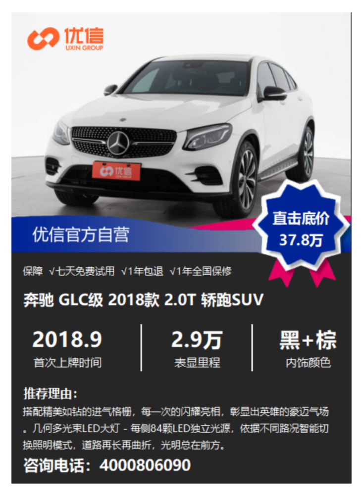 今天推荐的这款是纯进口的GLC Coupe的轿跑车型,说实话小胖哥比较喜欢这款车,尤其推荐给女孩子开,空间够用,时尚大气。