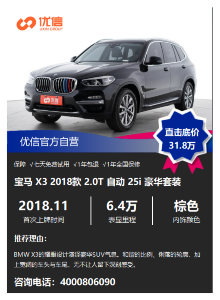 本以为宝马X国产后价格会下来一块,但是新车和二手车整体表现都并没有降价趋势,年轻用户购买比例高,尤其是女性用户对于大块头的“别摸我”情有独钟,最近价格更是有点提升,3年左右的尤其好卖!