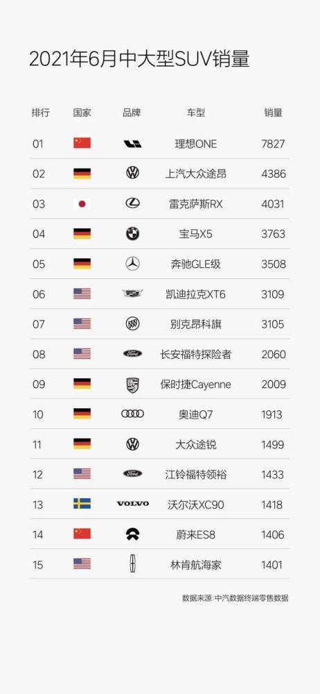 在中汽数据终端零售数据六月的豪华品牌排行榜中, 2021 款理想 ONE 首次进入豪华品牌前十名,超越了沃尔沃、凯迪拉克和奔驰等品牌。同时,在中大型 SUV 市场,理想 ONE 6 月销量超过上汽大众途昂、雷克萨斯 RX 、宝马 X5 等,拿下中大型 SUV 市场销量冠军。
