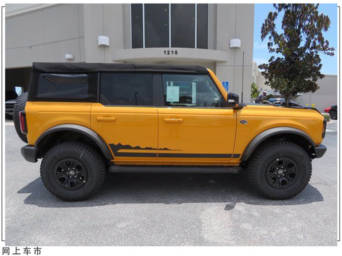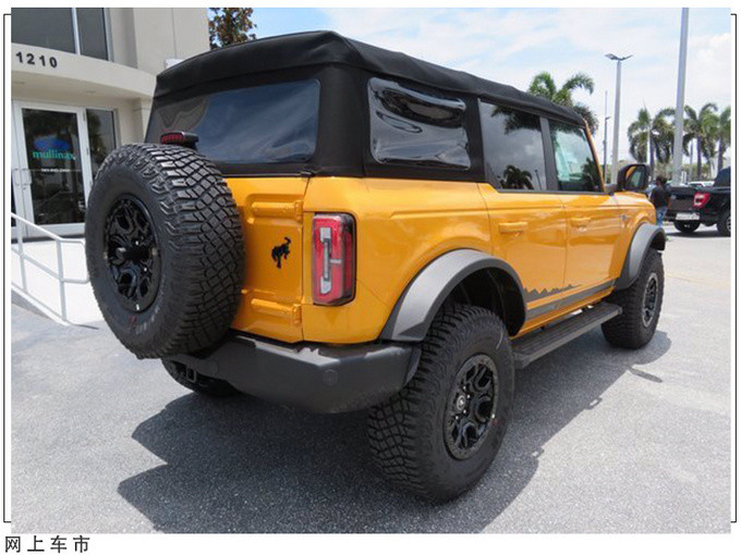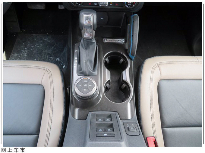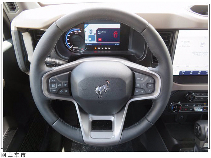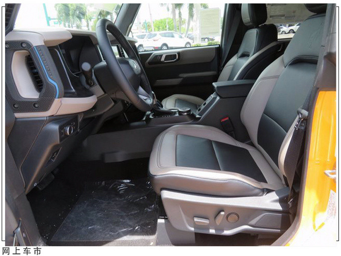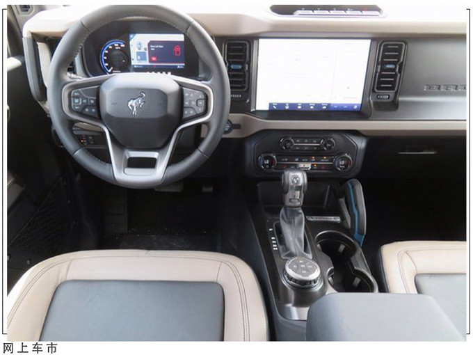外观上,福特Bronco采用了颇为硬派的设计风格,前脸的圆形灯组和贯穿式的矩形进气格栅与坦克300近似。车身侧面线条平直,配备有大尺寸防脱圈和越野轮胎,可拆卸布蓬软顶的设计也为该车增加了一丝野性的气息。内饰方面,新车中控台布局简洁,搭载有双色真皮座椅、大尺寸内嵌式中控屏以及机械指针与液晶的组合仪表。下方空调控制区域依旧为实体按键和旋钮,换档机构采用机械式设计,档把上方刻有Bronco家族的烈马标识,非常具有福特品牌的风格特点。