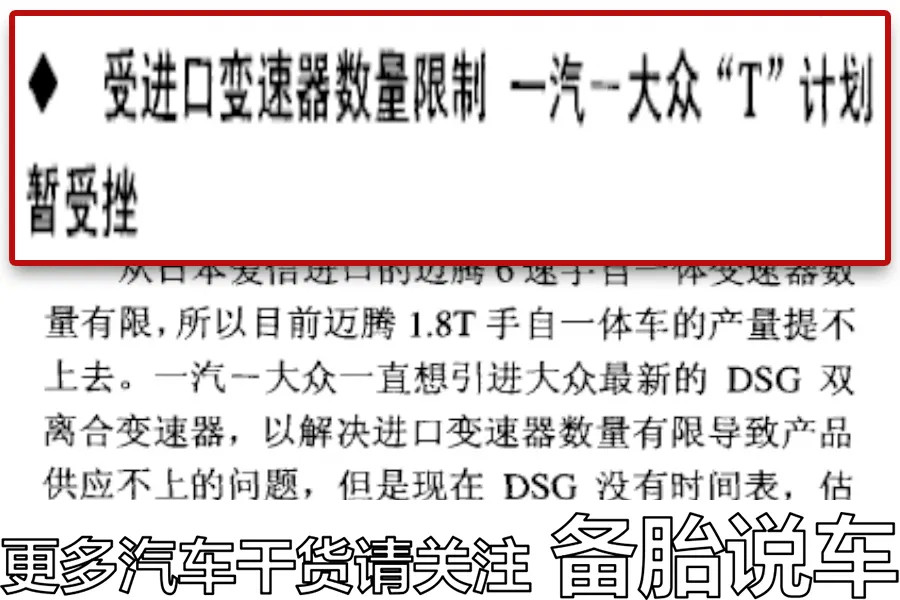 《汽车情报》期刊上面也有篇报道的,《受进口变速器数量限制 一汽-大众“T”计划暂受挫》。
