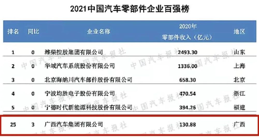 7月12日,《中国汽车报》发布2021汽车零部件企业“双百强”榜单,广西汽车集团登上2021中国汽车零部件企业百强榜。位列第25名。