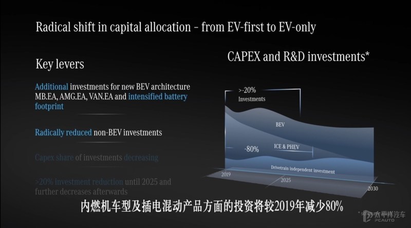 同时,梅赛德斯-奔驰正着力进一步缩减可变及固定费用,降低资本支出在投资中的比例。整体电池平台、可扩展电动车型架构及电池技术领域的突破,将帮助提升标准化程度并降低成本水平。整车的电池成本比例有望显著下降。2026年,内燃机及插电混动技术方面的投资将较2019年下降80%。基于此,梅赛德斯-奔驰预期纯电动时代的公司利润率将与内燃机时代相近。