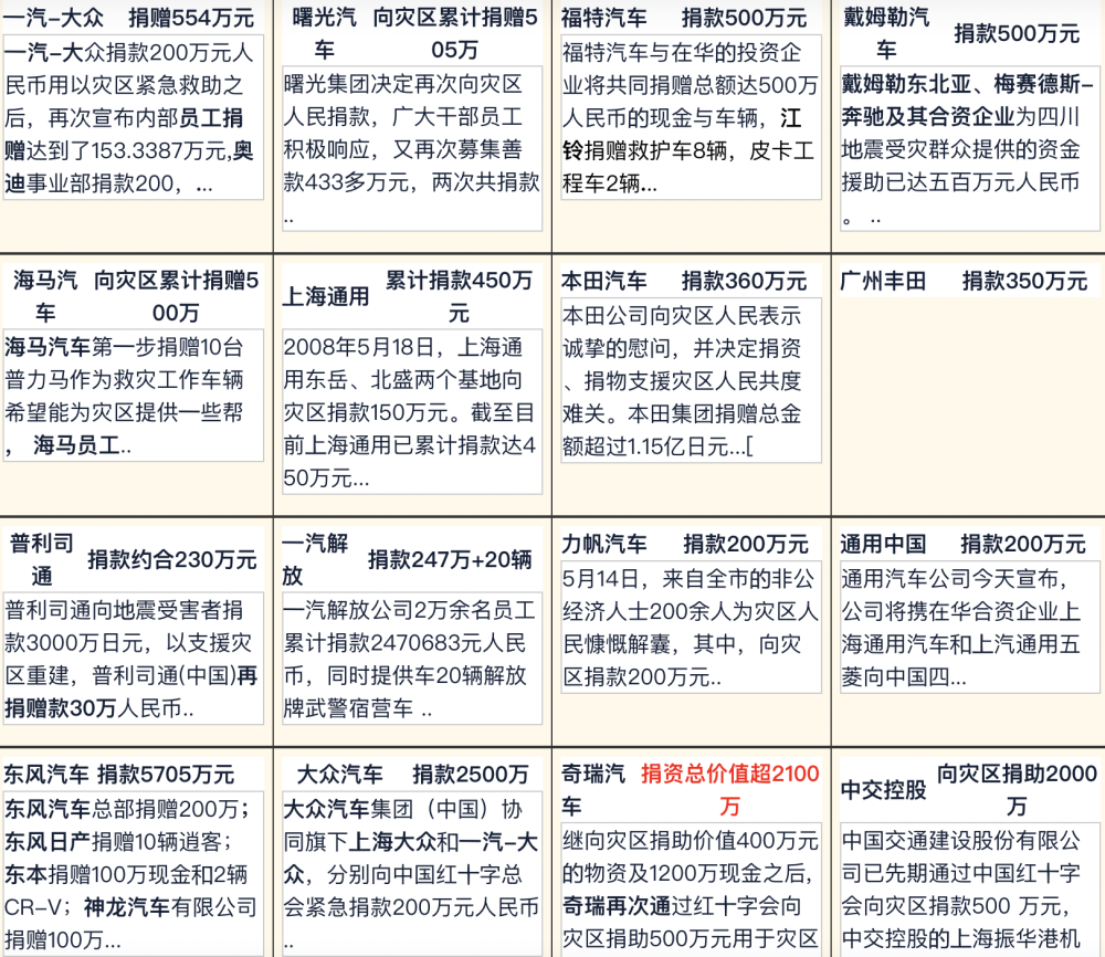 截止到目前,单单从现金支援方面,奇瑞目前动作最快,同时力度也是最大,中国自主品牌方面捐款最多的企业是吉利,也就是目前销量最多的龙头企业。