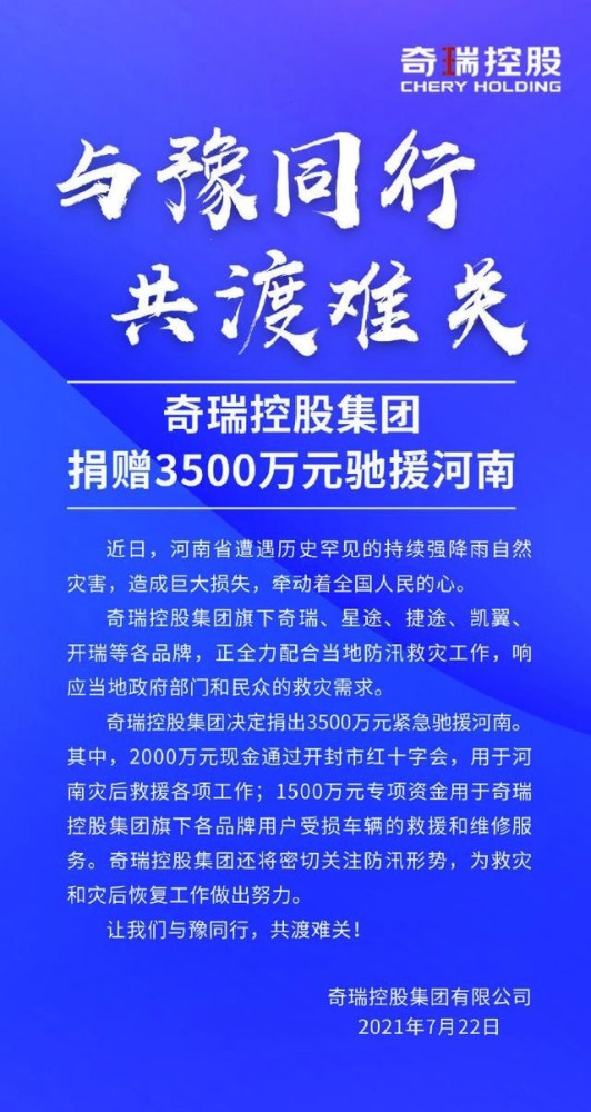 今日奇瑞控股集团宣布,为河南捐赠3500万,其中2000万现金通过开封红十字会流向洪水灾区,1500万用于奇瑞控股各品牌用户受损车辆的救援与维修。