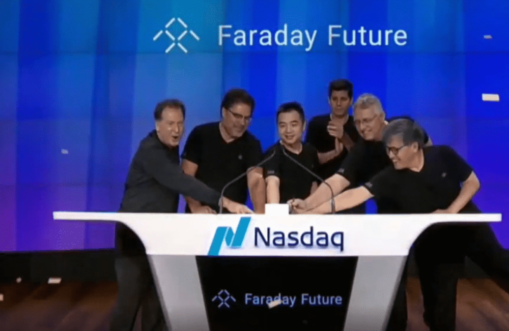 在法拉第未来(Faraday Future,FF)的上市现场,6位合伙人一起完成了敲钟仪式,而贾跃亭就站在台下,微笑着鼓掌。