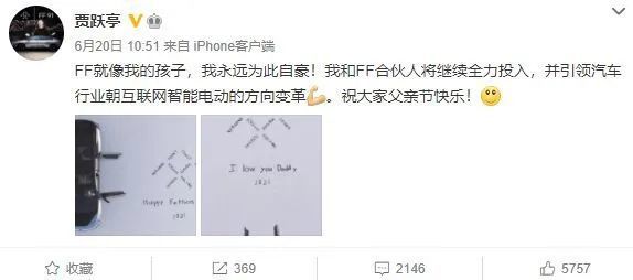 而就在两个月后的父亲节,贾跃亭发了一条微博——FF就像我的孩子,我永远为此自豪!