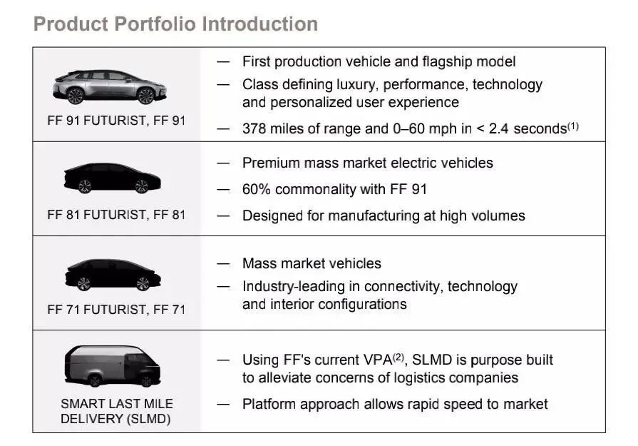 根据FF的计划,在FF 91之后,还将推出三款车型,分别为FF 81、FF 71和最后一公里配送车(SMART LAST MILE DELIVERY,SLMD)。