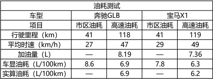 油耗测试方面,可以看到在里程和平均时速接近的情况下,奔驰GLB的油耗成绩都要稍微高于宝马X1。出现1.3T>2.0T的油耗成绩,主要原因是:1、奔驰GLB 7座+四驱系统,车身更重;2、四驱系统在油耗上有一定拖累;3、宝马X1的ECO PRO滑行模式经济性相当可以。甚至在官方公布的工信部油耗成绩里面(奔驰GLB 7L/100km;宝马X1 6.2L/100km),宝马的成绩都是要比奔驰好的。