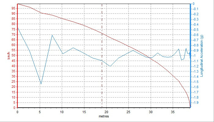 可以看到,制动力的分配是相对均衡的,配上温和的ABS(丝毫不会弹脚),软件调校依旧符合一线大厂的出品。最终做出的百公里制动成绩为40.12米,对于这个级别来说,能算得上良好的水平。