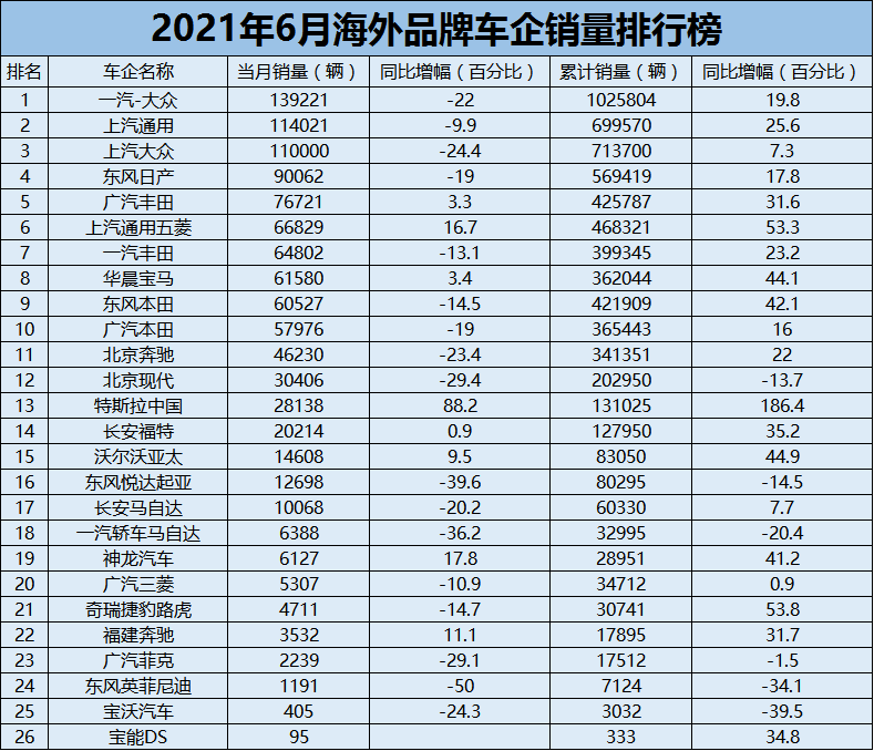 附:2021年上半年海外品牌汽车销量榜