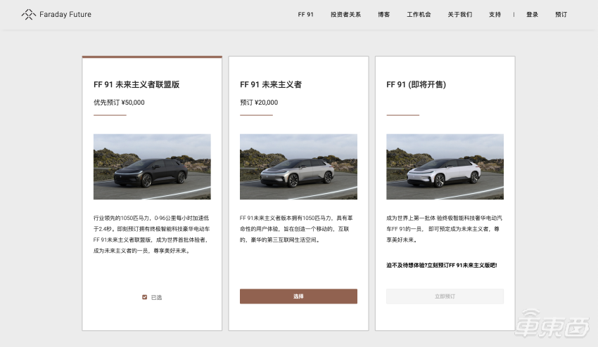 法拉第未来官网显示,先期发布的两个车型分别为FF91未来主义者版和FF91未来主义者联盟版,二者分别需要用户支付2万元或5万元人民币的定金才能预订。
