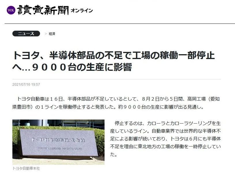 日经中文网消息,丰田日前表示,受半导体紧缺影响,日本高冈工厂(日本爱知县丰田市)的第1生产线将停产5天。据悉,该工厂第一生产线将从8月2日至6日停产。该生产线生产的“卡罗拉”和“卡罗拉Touring”将受影响。由于停产恰逢周一到周五,因而下月的停产,势必会影响高冈工厂卡罗拉车型的产量,预计将导致减产约9000辆(丰田日本国内月产量的4%左右)。