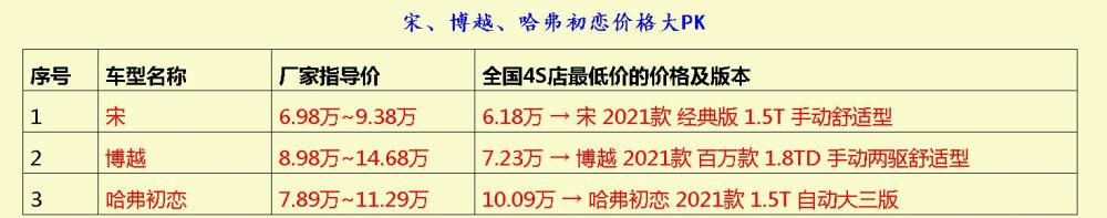 以上所列举的这三款车型中,价格有高有低,其中指导价相对较低的SUV是宋,再者是哈弗初恋,相对最高则是博越,三者价格是6.98万、7.89万及8.98万。我们知道,许多情况下指导价和终端价的差距还是蛮大的。资料显示,宋、博越、哈弗初恋的国内最低的裸车价分别是6.18万、7.23万和10.09万。由此可见,这些SUV价格差距还是比较大的,不知道各位看官看上哪一款呢?最后衷心祝愿亲爱的伙伴们百尺竿头、家庭幸福。