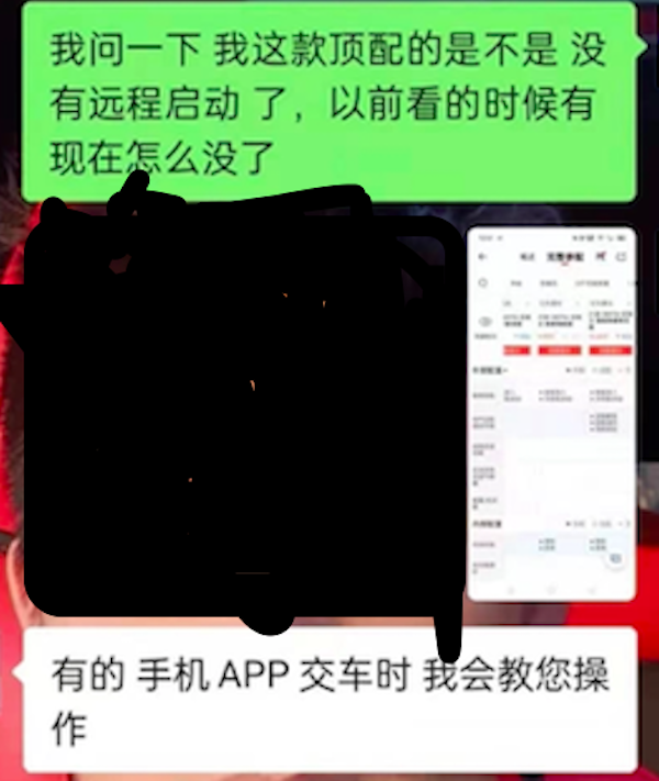 贺先生告知小编:当时本就是冲着远程控制功能方才购买此车辆,但结果却让人心寒。据了解,贺先生购车前曾明确询问4s店销售该车辆是否有远程控制功能,当时销售明确表示确实有该功能并且还向贺先生实际演示一遍,并且整个购车流程下来销售人员对减配问题只字未提。