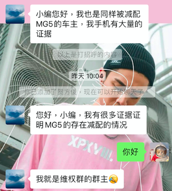 此前,小编曾对名爵减配车主投诉进行过跟进报道,其中车主向小编展示其群内150名车主皆遇到减配情况,次日该维权群群主贺先生与小编取得联系,告知小编其手中掌握较多证据,希望小编能够为其进行跟进。得知此事后小编随即与贺先生展开交流。