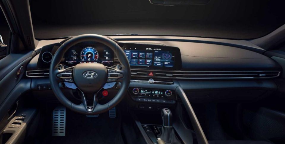 再来看看内饰,伊兰特N采用了北欧极简造型设计,其实有时候越简单越时尚,这台车它就做到了。细节方面加入了换挡拨片跟红色启动按键,让人时刻充满驾驶欲望。