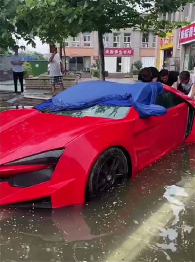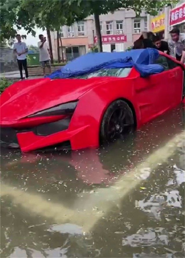这样一台“莱肯”超跑在街头被水淹了,细看就知道这是一台假的。