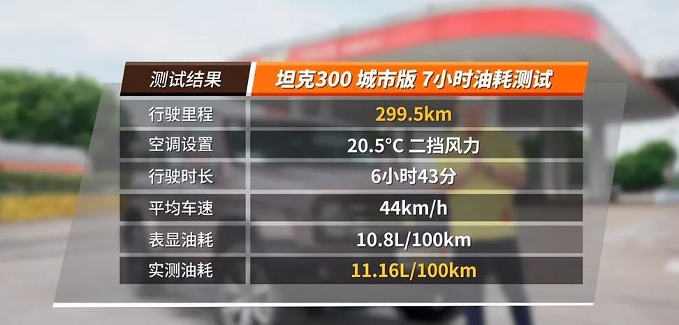 在经过了一天的油耗测试,坦克300城市版共计行驶了将近300km,表显油耗为10.8L/100km,实测的油耗为11.16L/100km。