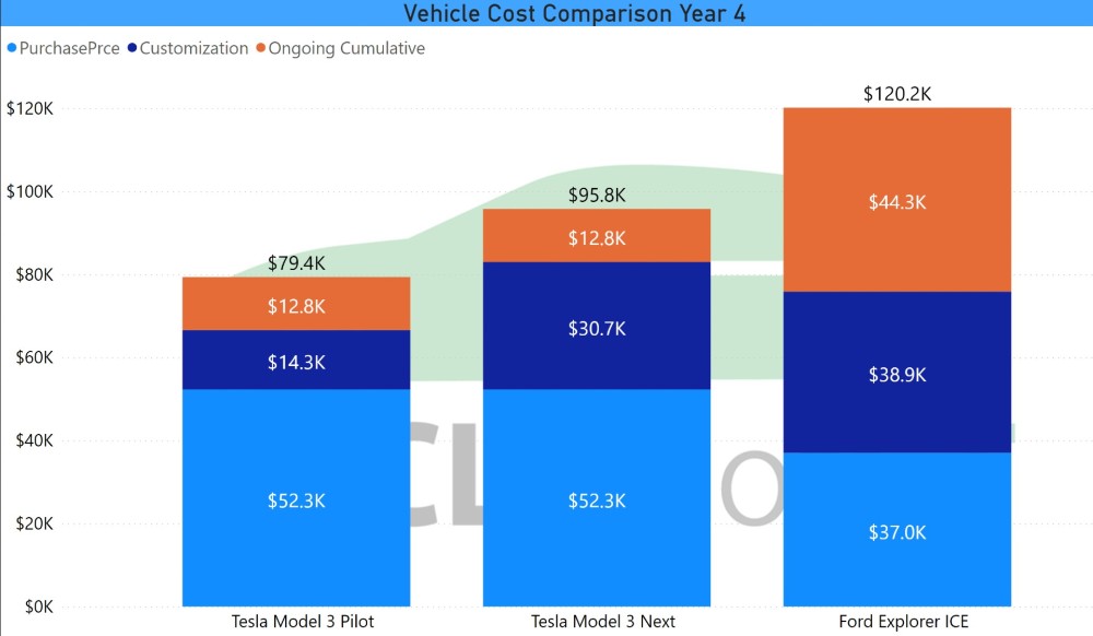 根据车辆第一年的成本比较分析结果表明,尽管 Model 3 的初始成本增加,但维护成本降低以及 Model 3 的定制加装等需求减少,为该部门节省了约 17,600 美元。基于日常维护和燃料成本,Model 3 的持续成本相对低于福特 Explorer。