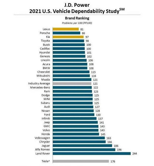 在之前的文章中,我们也提到了,在第三方JD.Power的调研中,捷豹路虎两大品牌今年依然锁定了新车质量排名的倒数前三,还有一个难兄难弟是来自意大利的阿尔法罗密欧。由此看来,捷豹路虎国产后的质量提升只是相比之前本品牌的水平。如果横向对比整个行业,捷豹路虎依然是质量差汽车品牌的代表。