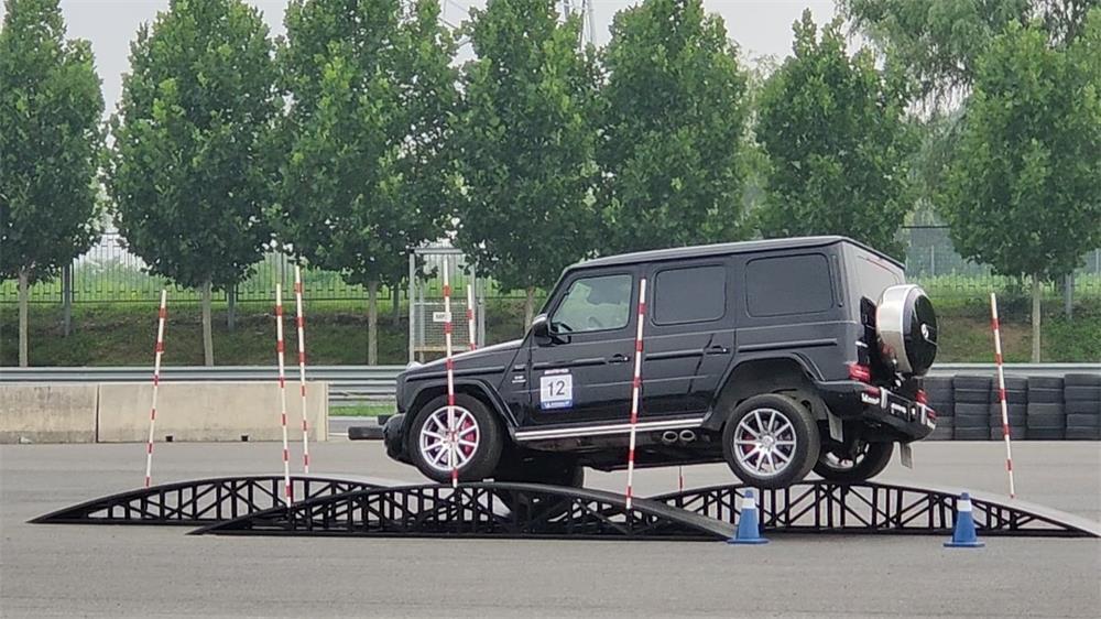 奔驰AMG G63搭载的同样是4.0V8双涡轮增压发动机,同时匹配AMG动态悬架。另外,在这台车上,越野档、差速锁、动态操控选择这些针对全路况应对一应俱全,再加上车辆本身出色的刚性结构与接近离去角度,让它在通过陡坡、交叉轴、倾斜路面等模拟场景化的科目时都可以轻松应对。