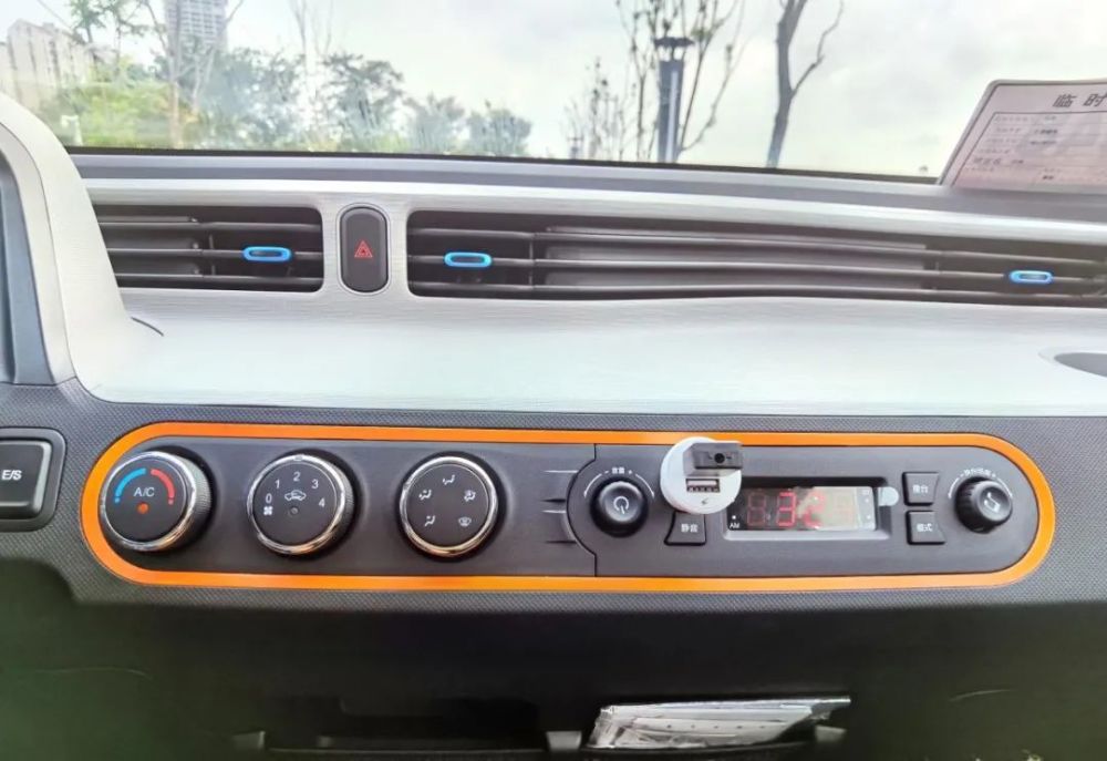 中控台部分,炎炎夏日坐在这样一台小车里,空调的制冷效果还是较为迅速的,副驾驶座前方有一个贴心的杯架,下方则是一些常用的物理按键。不过遗憾的是车内电源接口和USB供电插口稀缺,手机要连接蓝牙也需要再去购买一支车载蓝牙设备才能实现实时车机音源播报、导航与听音乐的需求,这一点上我觉得五菱官方厂商是需要改进的,MINIEV也更能获得车主们的青睐。