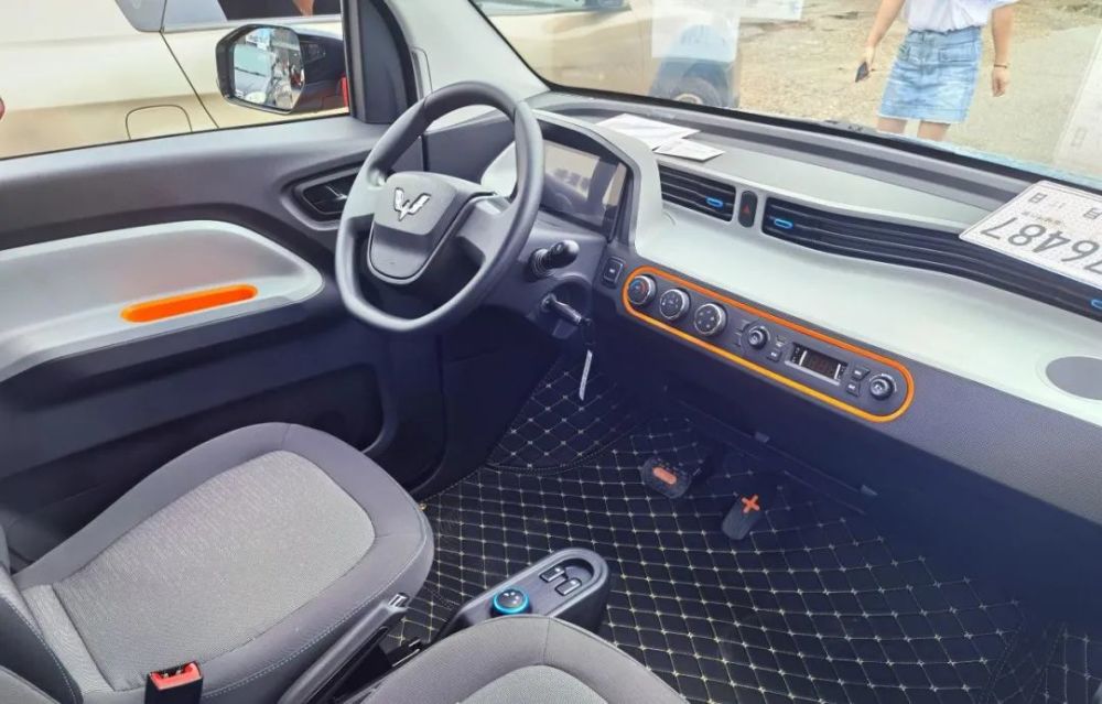 还有一处小问题值得说明的是,电门踏板的设计有点偏离主驾驶位,让小编腿部像是坐在“居中开车”,希望五菱官方厂商后续对此有所调整吧。而在我忙着检查外观的同时时,销售人员也早已经为它铺上了一层赠送的脚垫。