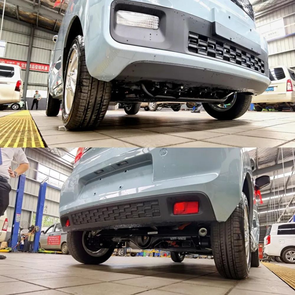 接下来是新车验车的环节,由于外面下起了雨,所以销售人员建议开到店内的售后修理厂区。首先整体查看了外观和车漆,核对车架号,了解出厂日期这些必备程序。MINIEV这台小车的整备质量为665kg;它的长宽高分别为: 2917*1493*1621mm;驱动方式为后置后驱;底盘结构采用前麦弗逊后三连杆非独立悬架;轮圈搭配的是一套145/70 R12的小轮胎。
