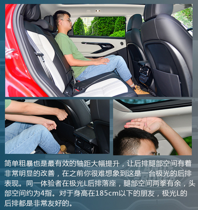 总的来说,标轴极光上的驾乘特性在这台极光L上依旧得到了保留,没有因为车身加长而影响它的操控灵活度,它依旧是这个级别最灵巧的选手之一。动力方面,满足日常依旧是足足够够,但对于追求速度的朋友来说,爆发感不算强;转向手感上有提升,细腻且女性驾驶员操作起来也会觉得轻松;在后排乘坐时,在面对一些颠簸路段,传递到车厢内的振感相较以往有所减轻,但还可以更加舒适一些。