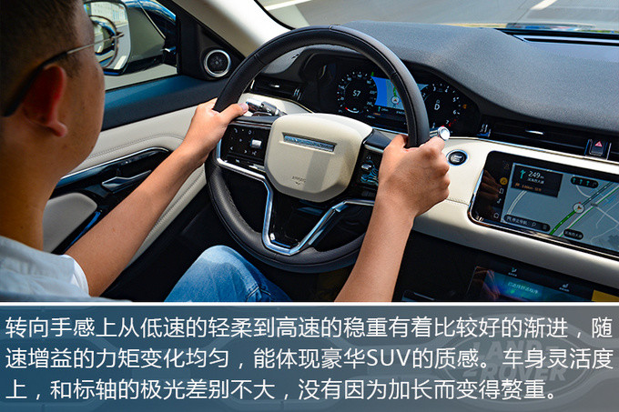 在行走机构上,极光L和极光基本保持一致,全系都为代号为PT204的2.0T发动机配合48V轻混系统,入门车型和中高配车型在发动机功率上有所区分,入门的P200车型为200马力,我们今天试驾的这台高配P250车型为249马力、365牛·米,传动系统部分皆为9AT变速箱。同样标配的还有路虎第二代全地形反馈系统。