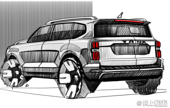 坦克600采用家族最新设计语言,前脸配备六边形横幅进气格栅,四周配备粗壮的镀铬饰条,搭配中央大尺寸LOGO,视觉效果十分霸气。车侧造型方正,腰线平直有力。新车尾部设计较为简洁,配有“TANK”字母LOGO标识,搭配两侧上下分体式的LED竖状尾灯组更显辨识度。
