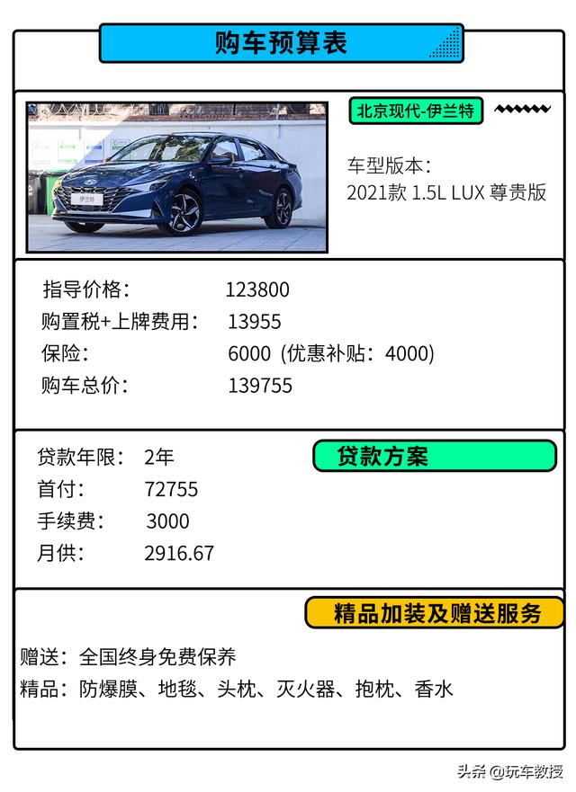 以上就是买买君为大家收集到的一些具有价值性的市场参考信息,总结来说伊兰特作为新车而言虽说没有优惠力度,但参考其指导售价,伊兰特在同级别市场当中顶配车型十三万出头的定价表现还是有一定的优势所在。其次,厂家在限定时间内推出终身保养的政策具有一定的吸引力,毕竟能够在后续的用车成本上省上一笔不小的费用。