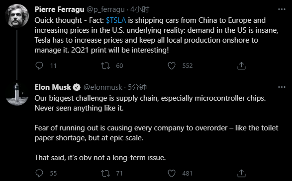 马斯克此前曾表示,特斯拉最大的挑战是供应链。他在推特上发文表示,特斯拉最大的挑战来自于供应链,尤其是微控制器芯片,从没见过这种情况。