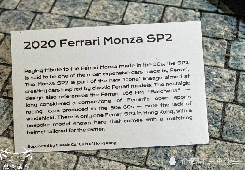 法拉利Monza SP有两款车,分别是SP1和SP2,SP1是单座跑车,SP2是双座跑车。SP于2019年开始生产,生产数量小于500台,当年新车售价160万欧元起,目前二手车270万欧元,而且是可遇不可求。