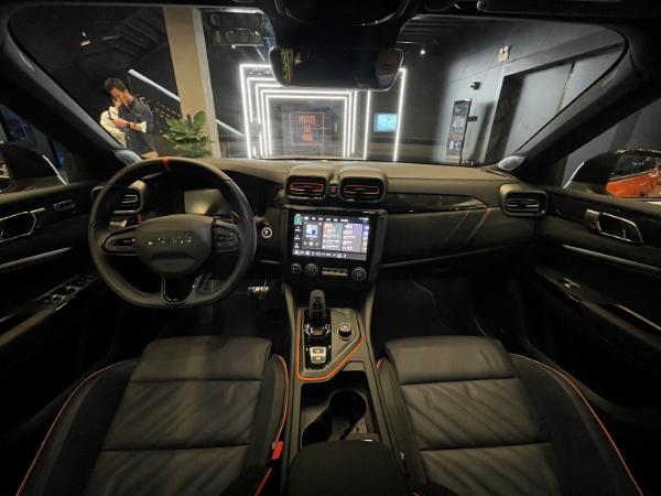新车的内饰基于领克02改造而来,在空调出风口、方向盘、挡把及座椅等细节处加入了撞色饰条点缀,看着更为精致和运动。