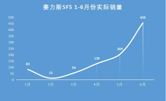 根据乘联会统计数据,赛力斯SF5在6月份的批发量是1097辆。而经销商实际交付了多少呢?中汽协统计的数据显示仅455辆。中汽协的数据统计来源于上牌量,我们可以理解为真实销量。
