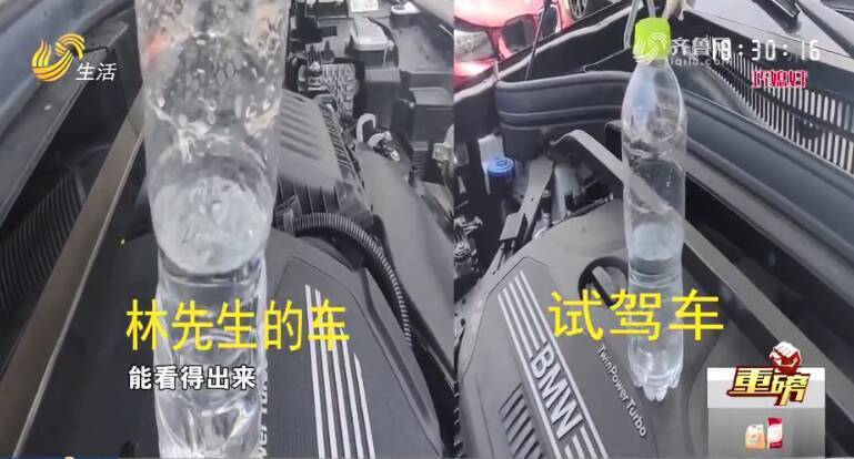 对此,烟台宝信汽车销售服务有限公司售后前台主管朱先生认为:“在这个发动机上,放置两个矿泉水瓶能看得出来,还是有一些不同的,但是目前来说就这个现象,我们不敢判定它肯定是有故障的。”