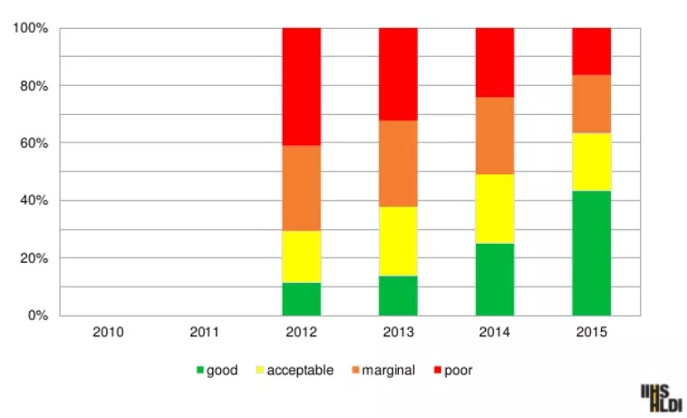 这种应试性安全在汽车界十分常见。比如,2012年IIHS引入的25%偏置碰撞测试难倒一片厂家,但随后数年,G评价车型的比例逐渐提高。当年中保研推出25%偏置碰撞,同样很多车型都翻了车,但在今年中保研发布的碰撞测试成绩中,所有车型都拿到最高的G评价。