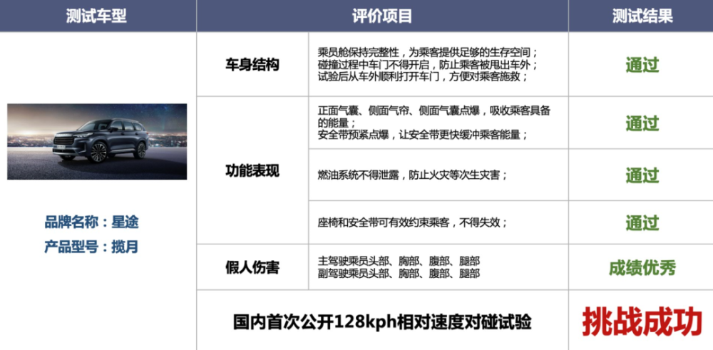 安全作为看不见的产品点,很多车企都只是以测试标准作为最高的研发目标。而星途揽月则是站在用户的角度,打造出了领先于行业的超标准、超五星安全性。这不仅彰显出星途对用户负责、为用户着想的造车理念,更是星途强劲的研发实力、自信的技术底气的深刻体现。