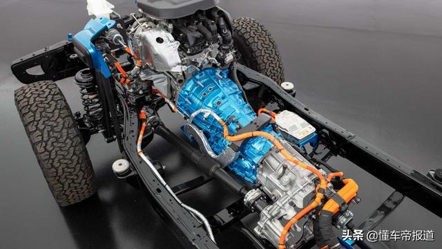 同时,第二台高压电机安装在变速箱箱体前部,取代了自动变速箱的传统变矩器。两个离合器的作用是管理电机和发动机的功率和扭矩。发动机和电机之间装有二元离合器(开/关)。二元离合器打开时,发动机和电机之间机械连接断开,使牧马人4xe能在纯电动模式下被启动。二元离合器关闭时,2.0T发动机和电机的扭矩通过自动变速箱结合。安装于电机后方的可变离合器控制着与变速器的啮合。