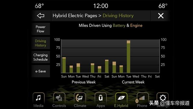电动模式顾名思义就是以纯电驱动,动力系统仅以电动机输出驱动力,当电池降至最低电量或驾驶员需要更大扭矩(如油门全开)时,再启动2.0T发动机;eSave模式则可理解为发动机优先模式,该模式下主要使用2.0T发动机输出动力,从而保留电池电量。在eSave模式下,驾驶员还可以通过Uconnect交互系统显示屏中的混合动力电动页面选择“省电”或“充电”状态。