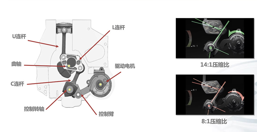 2017年,全新英菲尼迪QX50于洛杉矶车展亮相,这是首款搭载日产VC-Turbo可变压缩比技术的车型,也使VC-Turbo成为首个搭载量产车型的可变压缩比技术。日产在发动机曲轴下方额外增加了一根控制轴,通过控制臂(A连杆)与电机连接。当行车电脑认为车辆进入巡航状态时,启动电机将控制臂(A连杆)向外推出,此时控制轴通过C连杆改变L连杆的角度,而连接在L连杆另一端的U连杆的角度也相应做出改变,提高了活塞上止点,实现了气缸内的压缩比从低到高的改变,变成了更省油的高压缩比状态。